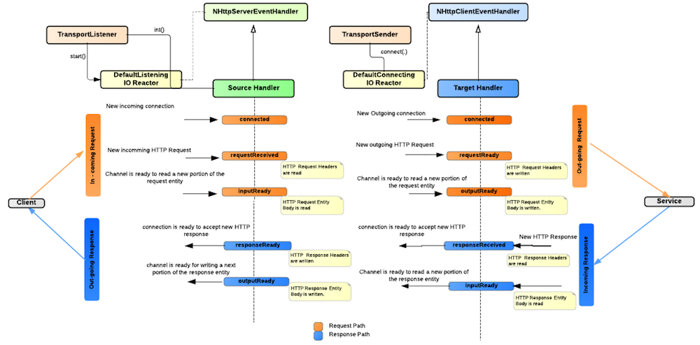 - Once this notification is received by the worker thread, it will execute the processNewChannells() method within the AbstractIOReactor and During this process it will create a new HTTP session and call the Connected method on the SourceHandler (State Connected)